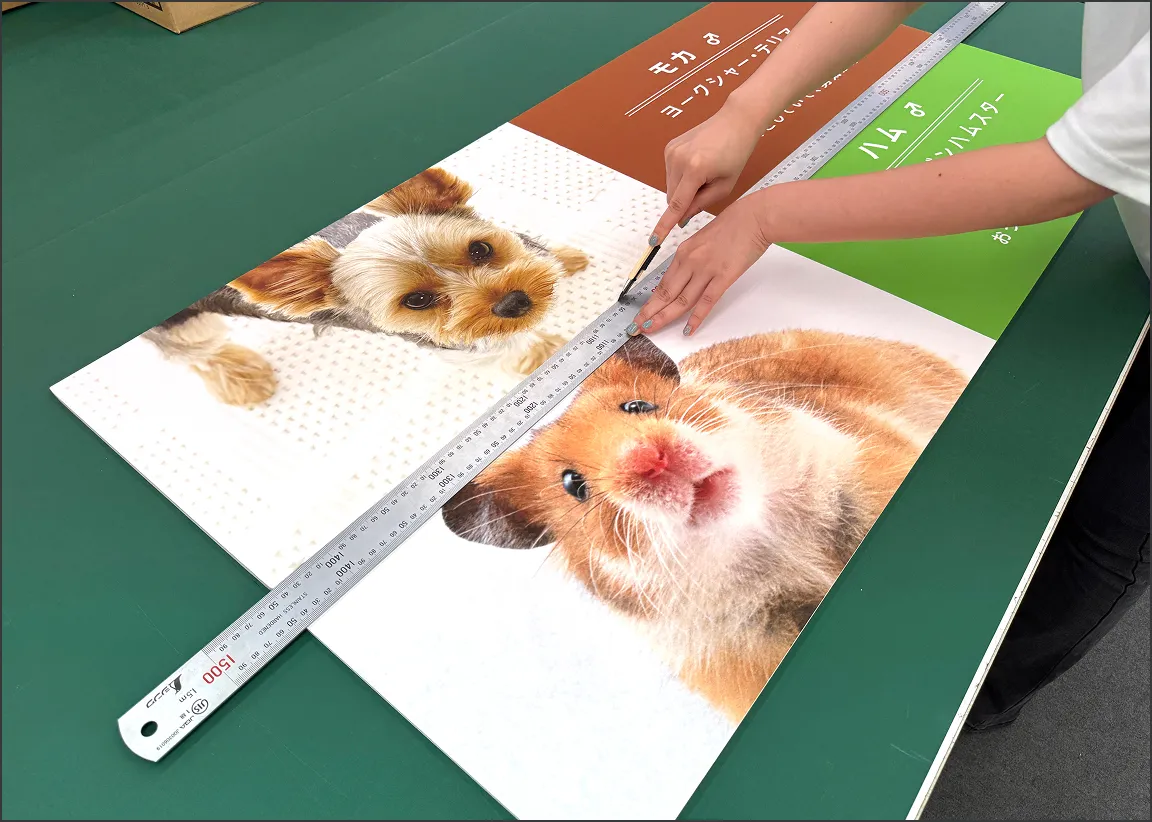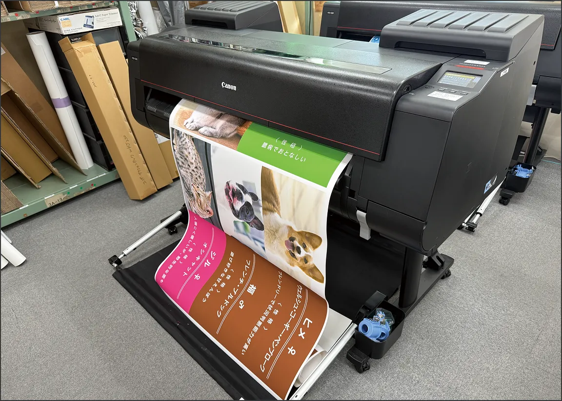 大型インクジェットプリンターを使用し、幅広いサイズに対応した高 精度な出力が可能です。最大出力幅は1120mmで、ロール紙の長さ 分まで出力できるため、長尺物にも対応可能。ポスターやバナーな ど大判サイズの制作にも柔軟に対応できます。 -